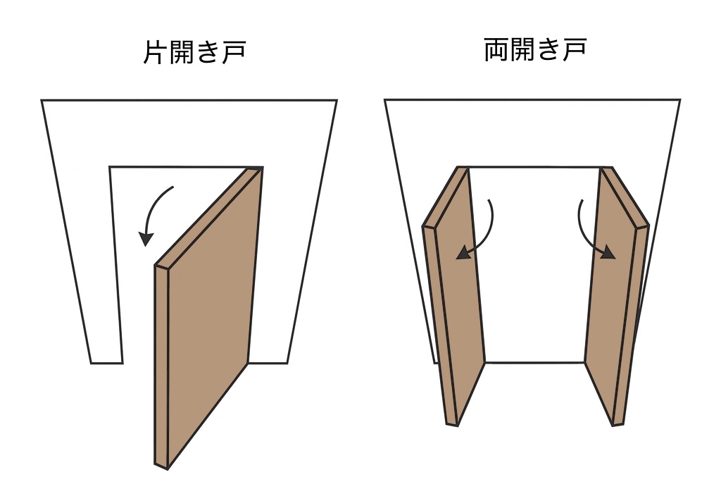 開き戸とは、蝶番を使って片側に固定し、前後に開閉するドアを指します。
