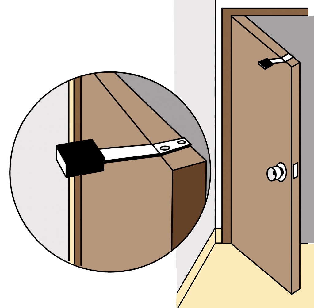 ドア上部(又は下部)にドアストッパーを付け壁にぶつからないようにするための緩衝材としての役割をもつ。