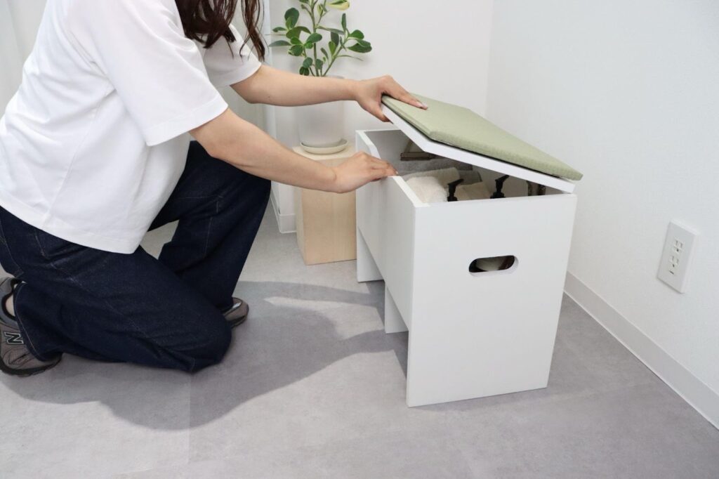 座面を開けると中は大容量の収納スペース。靴のお手入れグッズ、日用品のストック保管、子どもの外遊び道具など、玄関に置いておきたいものを隠して収納できます。